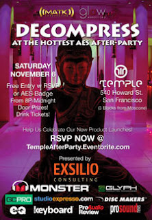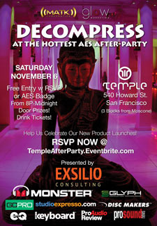 San Francisco, CA, (October 15, 2010) – DECOMPRESS is slated to be the hottest after party of AES San Francisco. Its free-of-charge with RSVP at http://templeafterparty.eventbrite.com. Taking place at Temple Nightclub on Saturday November 6th at 8 P.M., the event is produced by Glow Marketing and MATK Corporation, and supported by Exsilio Consulting Inc, Monster Cable Products, New Bay Media, Disc Makers, GCPro, Glyph, and Studio Expresso.
